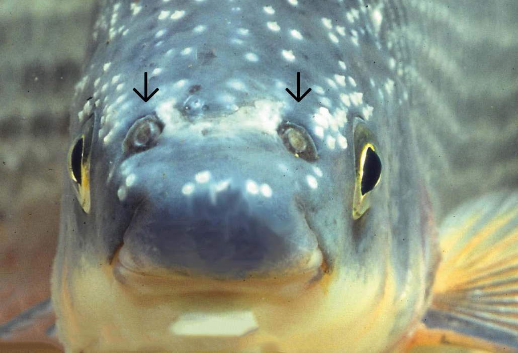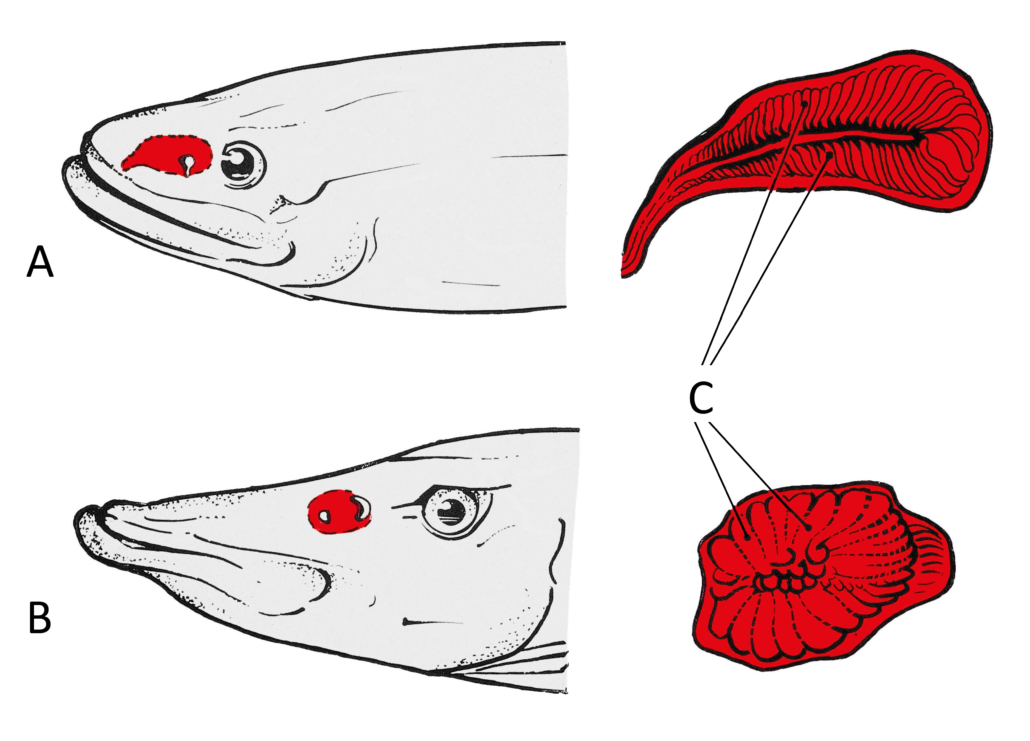 Bei Fischen sind die Geruchsorgane paarweise angelegt. Sie befinden sich zwischen Maul und Augen.