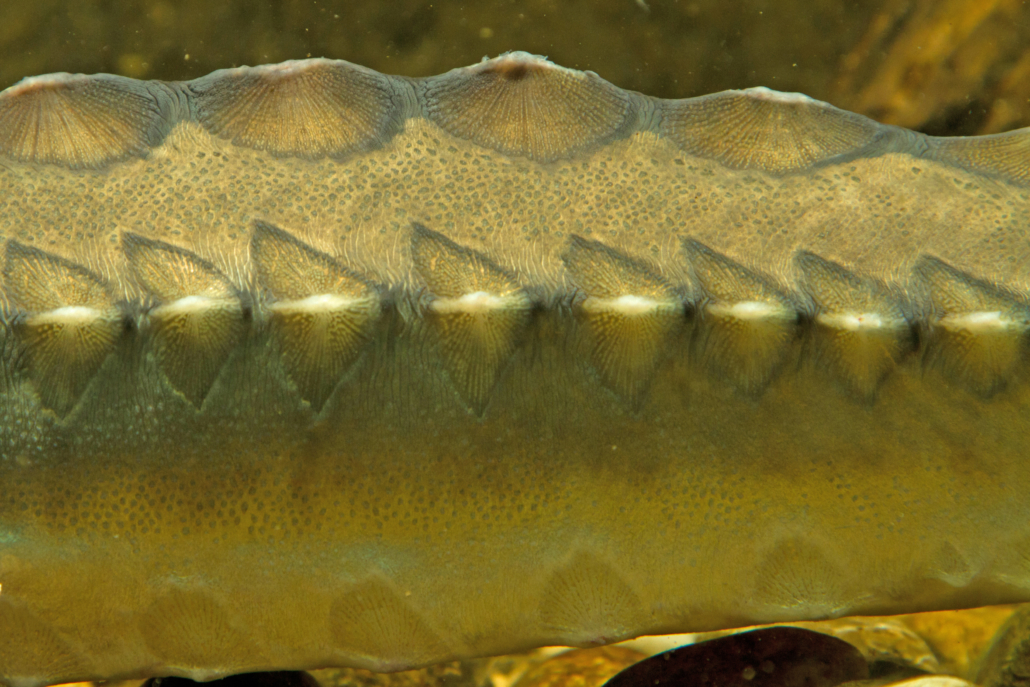 | Atlantischer Stör: | Kopfoberseite: keine Fontanelle (Schädelknochen auf der Kopfoberseite ohne Lücke) Knochenplatten mit radiären Knötchenreihen (Tuberkelreihen) |