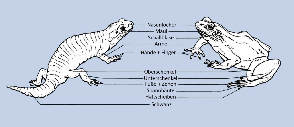 Die Bezeichnung „Amphibien“ (von griech. amphi = zweifach) bedeutet doppellebig und weist auf die Fähigkeit der Tiere hin, zu Beginn ihres Lebens im Wasser (Jugendstadium als Larven) und später an Land (Erwachsenenstadium) zu leben. Amphibien sind wechselwarme Tiere oder Kaltblüter. Ihre Körpertemperatur ist abhängig von der Außentemperatur.