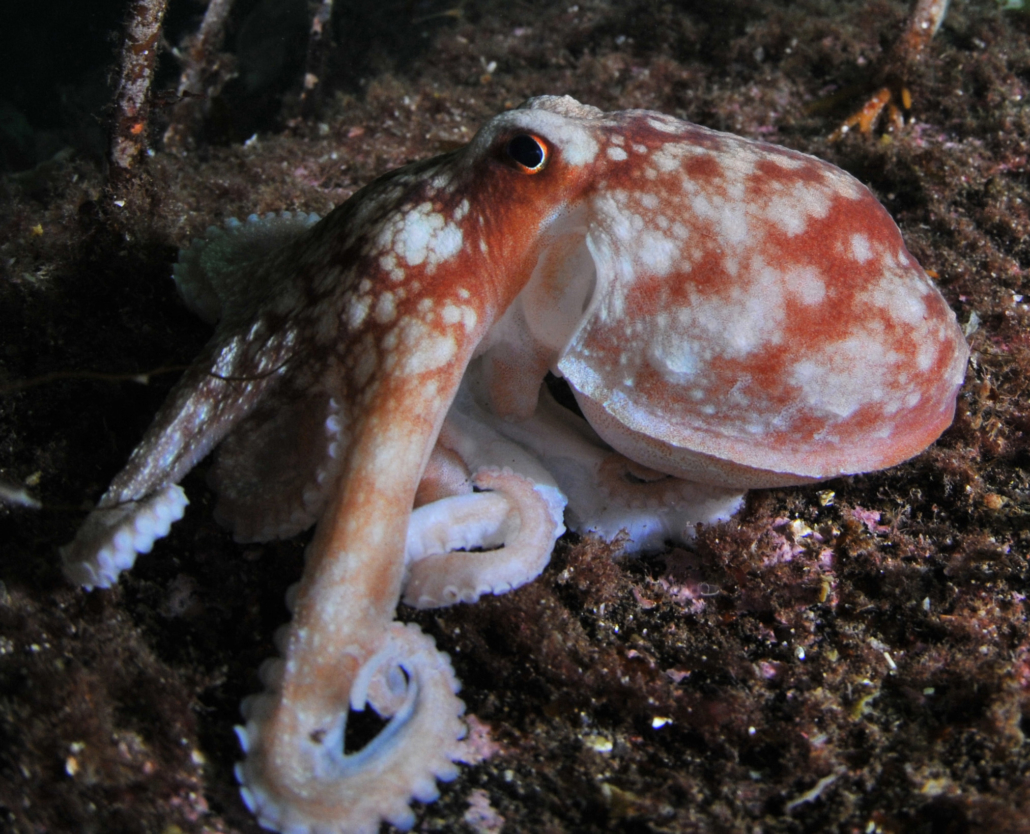 Der Krake kann sehr gut schwimmen, hält sich aber vorwiegend in Küstennähe auf und lauert in einem Versteck nach Beute.